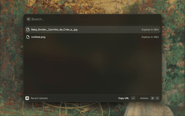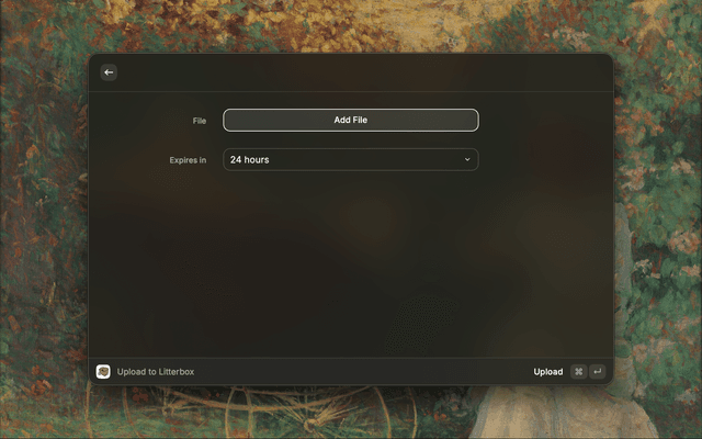 Upload files to Litterbox from Raycast with a file picker, set expiry (1h, 12h, 24h, or 72h), and get shareable links. Recent uploads are listed until they expire.