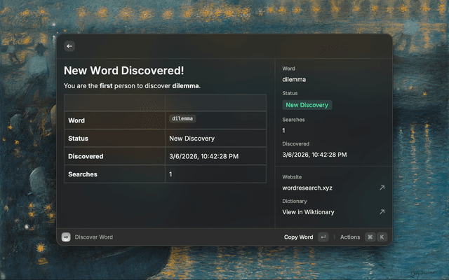 Enter any word to check whether it has been discovered before. The command shows whether the word is new or already known, along with the discovery date and total search count.
