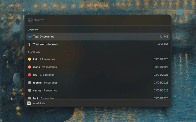 View overall Word Research stats, including total discoveries, total indexed words, and the current top searched words leaderboard.