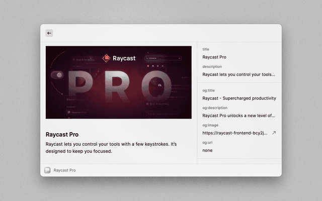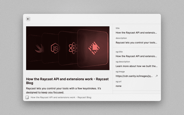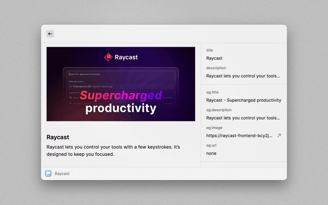 This is a simple Raycast extension that allows users to quickly check the Open Graph (OG) meta tags of any webpage. This tool is especially useful for developers who need to verify if the right OG tags are rendered for different pages during development, or for anyone who wishes to preview the thumbnail or other OG tag information of a website.