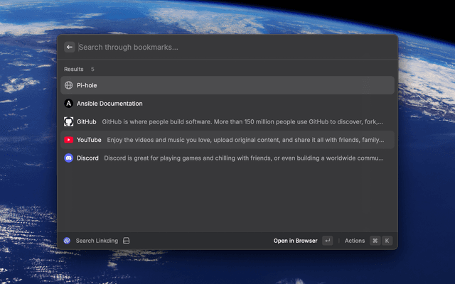 Uses Raycast to search through Linking bookmarks.