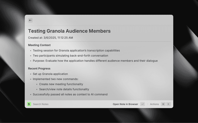 • Search Notes - View your notes in a list, see their details (including transcript), copy their links, or copy their contents as HTML or Markdown