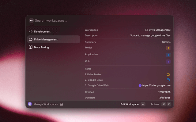 - ๐ฆ Workspace Bundles: Group apps, folders, files, URLs, and terminal commands together