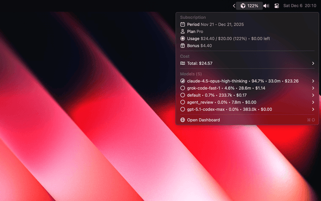 • Menu Bar Display — Shows usage percentage, cost, or both with customizable icon