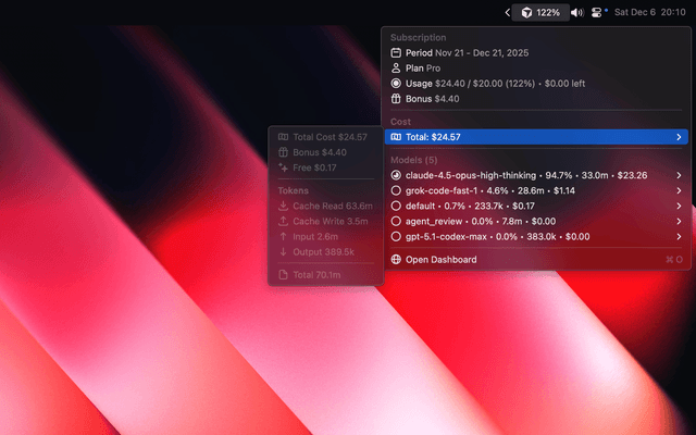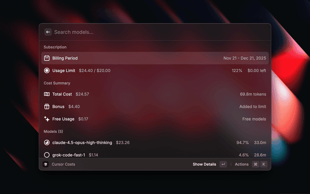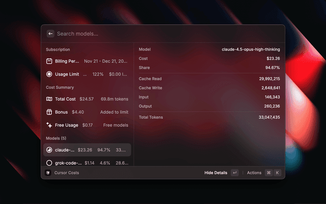 Track your Cursor costs in real-time directly from macOS menu bar with this Raycast extension.