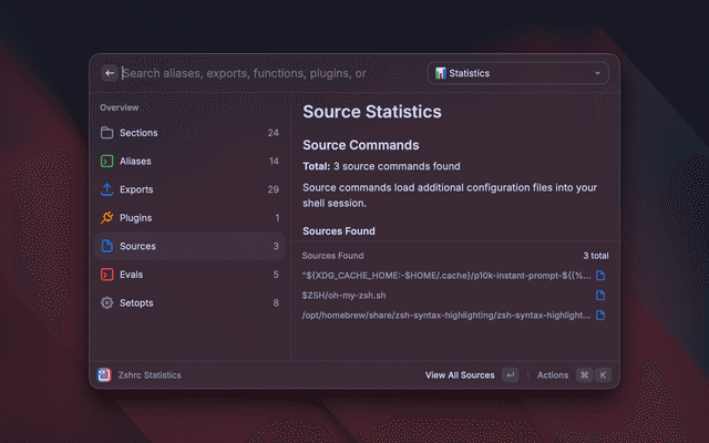 | 📝 | Section Management | View zshrc content organized by logical sections with detailed breakdowns |