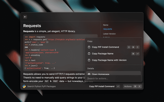Search PyPI packages from Raycast and read all details.