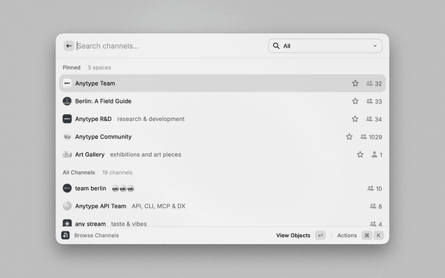 • Open: Use Command+Enter to instantly open the currently selected space or object in Anytype.