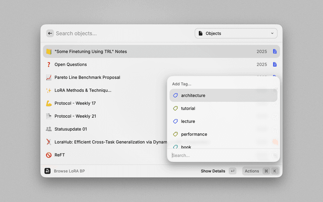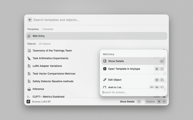 • Interact: Press Enter to view the object in Raycast or Command+Enter to open it in Anytype.