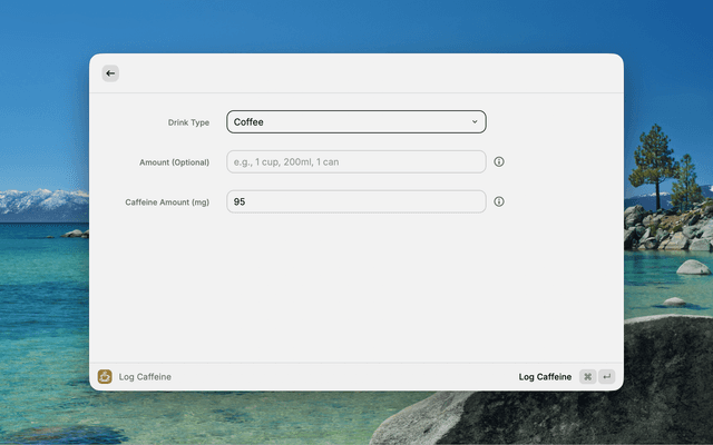 - Quick Logging - Built-in presets (Coffee, Espresso, Tea, Energy Drink, etc.) and custom drinks
