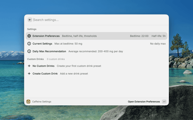 Instead of just tracking total daily intake, this extension estimates the remaining caffeine in your body using exponential decay calculations and uses that plus time of day to determine whether additional caffeine is likely to disturb your sleep.