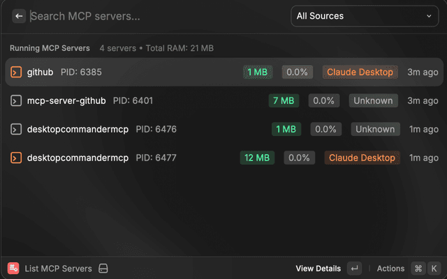 A Raycast extension to view and manage MCP (Model Context Protocol) servers running on your Mac.
