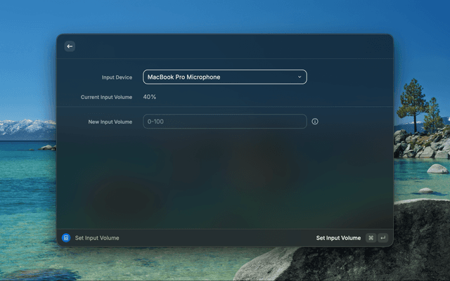Set exact volume. "Set Output Volume" and "Set Input Volume" commands let you enter a specific volume (0-100) and optionally pin it.