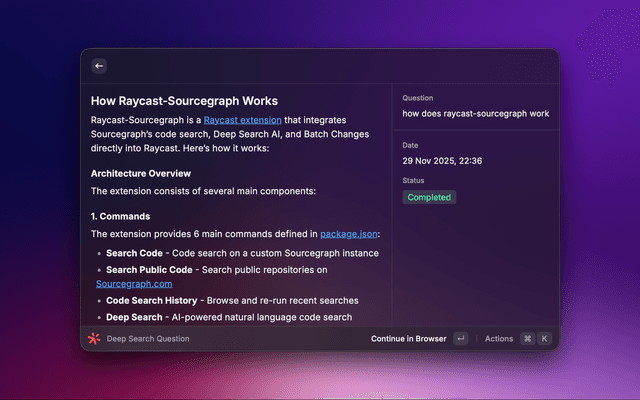 Deep Search, Code Search, and Batch Changes on Sourcegraph with Raycast.