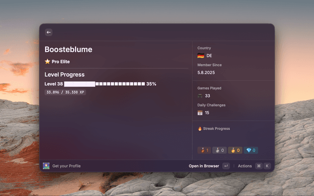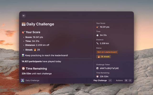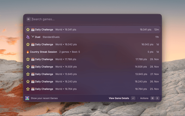 View your GeoGuessr profile, track daily challenges, and analyze your game history right from Raycast.