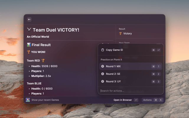Plonk It Integration: Each round includes a quick action to open Plonk It for practicing that specific country (keyboard shortcuts: Cmd+1 through Cmd+9 for rounds 1-9).