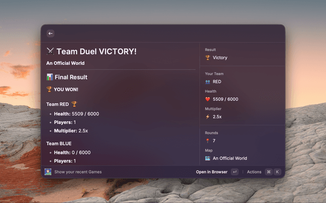 For Duels: Displays team comparison, health tracking, victory/defeat status, rating changes, win streaks, and damage dealt per round.