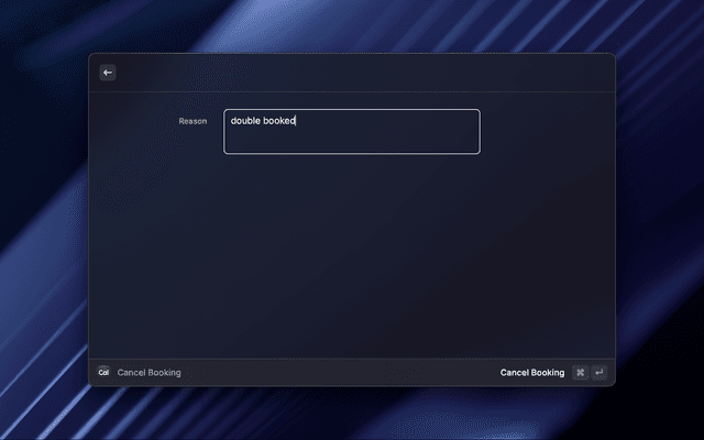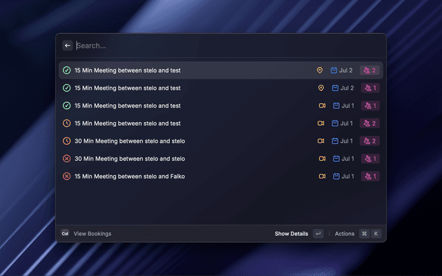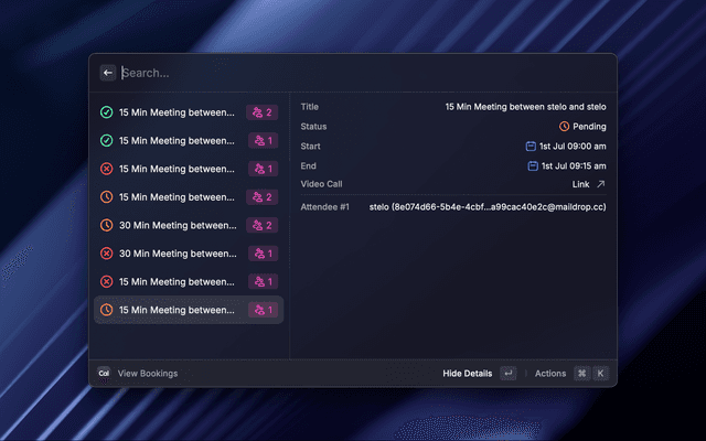Quickly share your Cal.com meeting links, generate private links, view and cancel bookings.