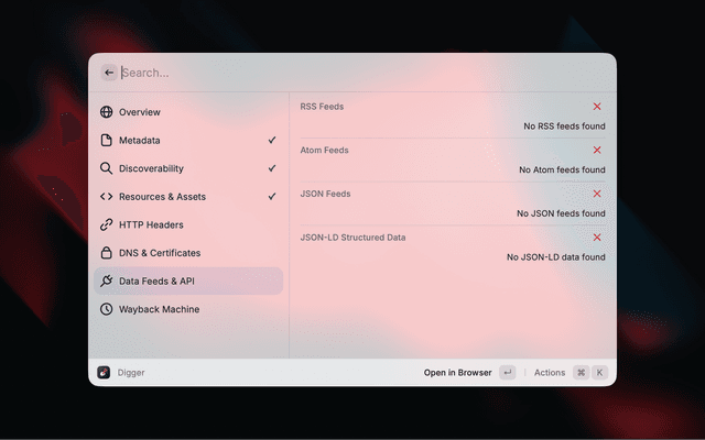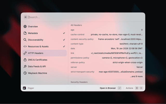 Digger surfaces contextual information about any website without needing to open developer tools. Enter a URL and instantly see metadata, SEO signals, security info, DNS records, and more.