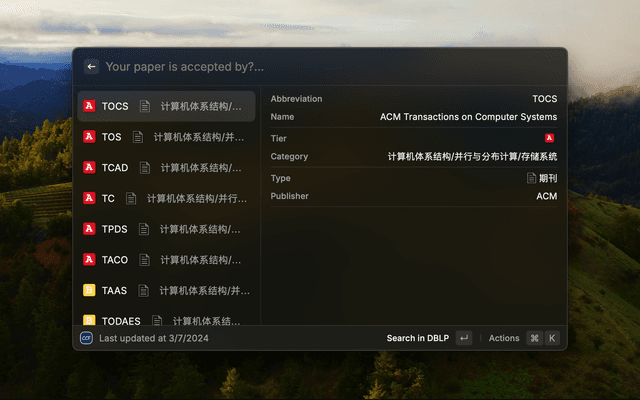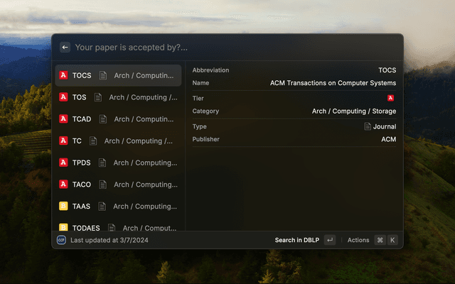Loop up the rankings of China Computer Federation (CCF) recommended publications in Raycast.