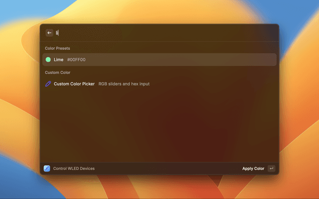 Control your WLED LED strip devices directly from Raycast. Manage multiple devices, adjust colors, brightness, and apply effects with a simple, unified interface.