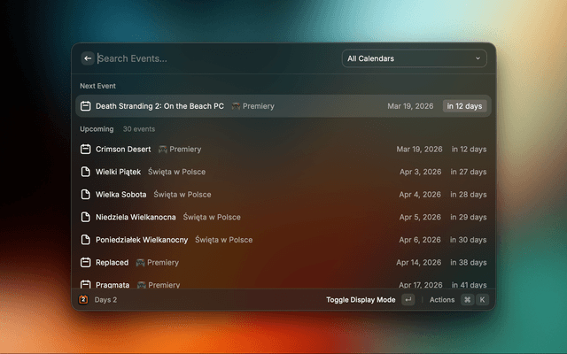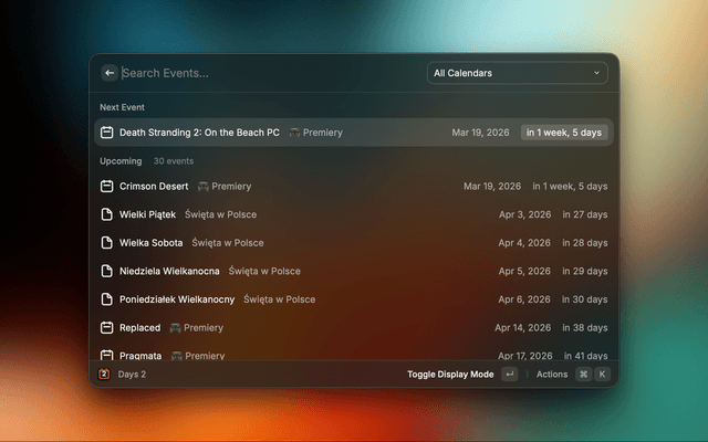 • Background refresh — automatically updates a subtitle in Raycast root search showing the nearest event (e.g. "Birthday – 12 days"), refreshes every hour