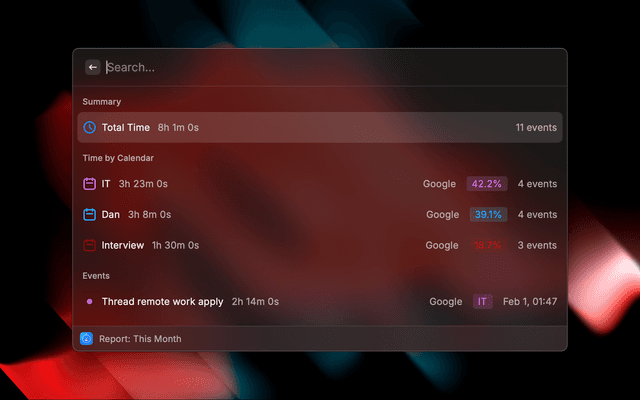 - View total time, breakdown by calendar with real calendar colors, and percentage distribution