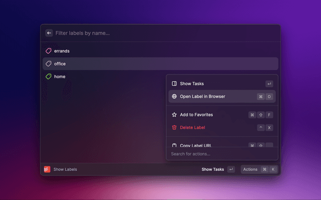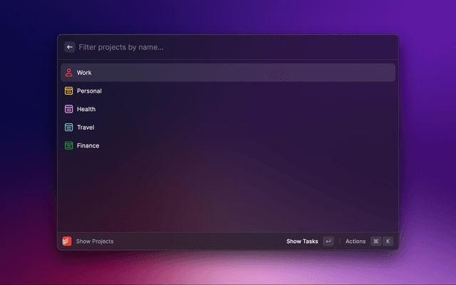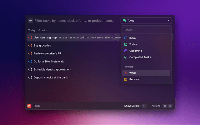 Check your Todoist tasks from within Raycast and quickly create new ones.