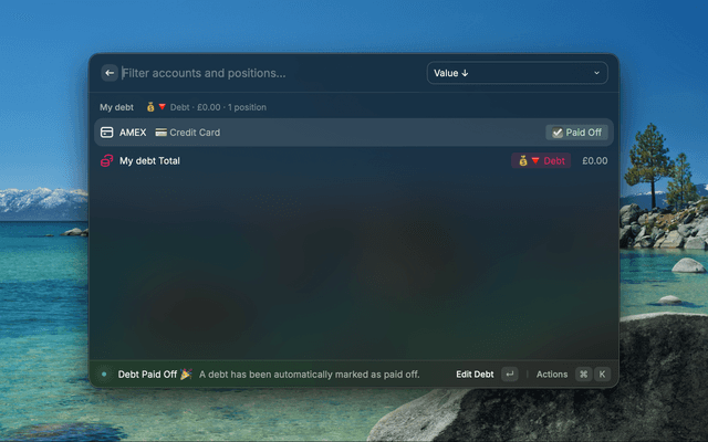 All types of debt — credit cards, personal loans, student loans, auto loans, and buy-now-pay-later. Fixed-term loans include start and end dates with amortisation schedules. Open-ended debts like credit cards track balances with APR and monthly repayments. Repayments are auto-applied each month: the tracker calculates interest accrual and principal reduction for you, detects when a debt is fully paid off, and lets you archive it to keep things tidy. Debt balances are subtracted from your portfolio to give a true net worth figure.