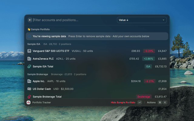 Track your investment portfolio and net worth in real time across multiple accounts, directly from Raycast.