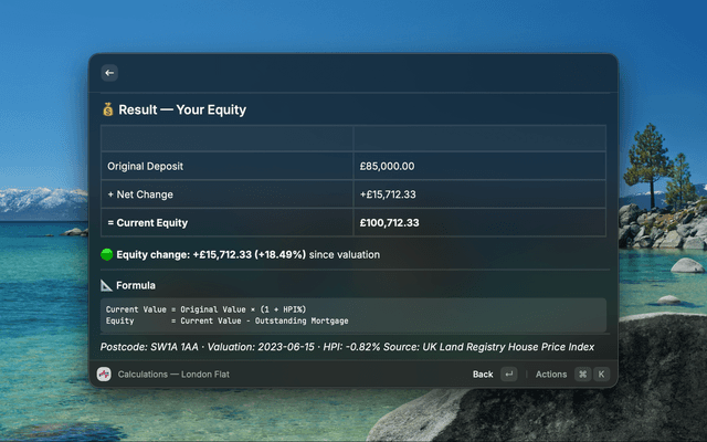 Add properties with or without a mortgage. Mortgage positions include full principal repayment tracking, UK HPI-based appreciation by postcode, shared ownership support, and a step-by-step breakdown of every calculation — equity, principal repaid, market movement — so you always know exactly how the number was derived.