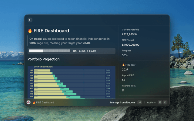 The FIRE (Financial Independence, Retire Early) dashboard reads your portfolio value and projects it forward against your configured targets. Set your FIRE number, expected growth rate, inflation, withdrawal rate, and retirement age — then add your recurring monthly contributions from any account. The dashboard renders a visual projection chart showing when you'll hit your target, how old you'll be, and how many days (and working days) you have left. Adjust assumptions on the fly and watch the projection update instantly.