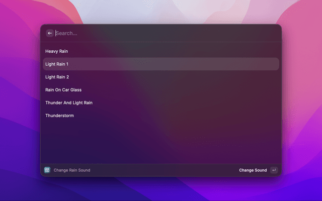 Control rain and snow and background sounds on your Mac with Rainaissance through Raycast.