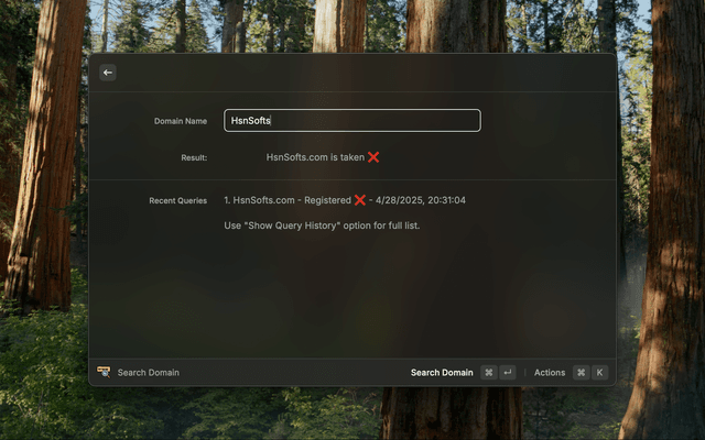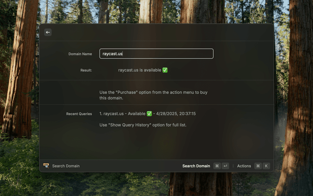 This extension only sends domain names to the API for checking availability. No personal data is collected or stored outside of your local Raycast environment.