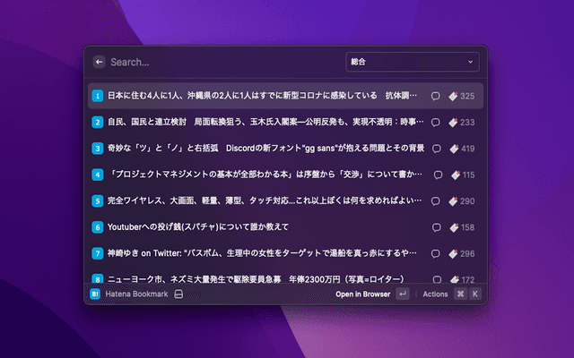 Hatena Bookmark is a bookmark service. This extension get hotentry list from each category rss feed. You can see bookmark count, open site url and comment page.