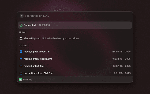 • The "Lazy Upload": Slice your model, export to .3mf, upload via Raycast, and hit print. Zero steps left.
