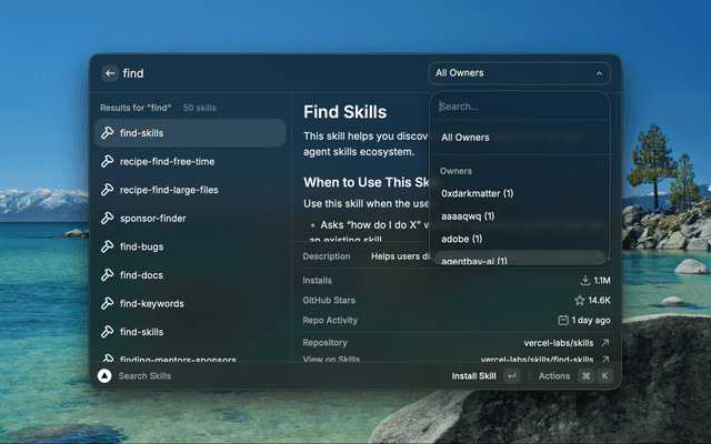 Search for agent skills from skills.sh with real-time results. View skill details in the inline panel, including security audit status when available.