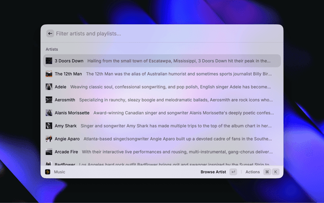 Browse Library: browse the selected Plex music library, artists, albums, playlists, and queue tracks or entire albums in PlexampSearch Library: quickly search artists, albums, and tracks and play/queue them in PlexampNow Playing: see what's playing, control the transport and adjust the queueNow Playing Menubar: show the current album art and a customizable now playing label in the macOS menu barPlexamp Status: inspect the connected Plexamp client and selected Plex music libraryPlexamp URL Override if your Plexamp or Plexamp Headless instance is not available at http://127.0.0.1:32500.Menubar Format with {track}, {album}, and {artist} tokens for the Now Playing Menubar command.Now Playing.Now Playing.Plexamp Status.5 Stars, 5 Stars (Half Stars), or 1 Star.