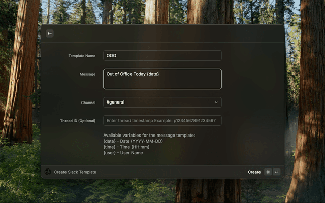 Create Slack TemplateDaily Report){date} - Current date (YYYY-MM-DD){time} - Current time (HH:MM){user} - Your Slack usernameSend Slack Message⌘ + E to edit or ⌃ + X to delete the selected templateExport Templates~/Downloads/slack-templates.jsonImport Templates
