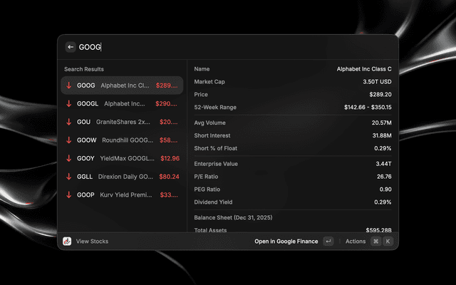 Look up stock prices from Google Finance directly in Raycast.