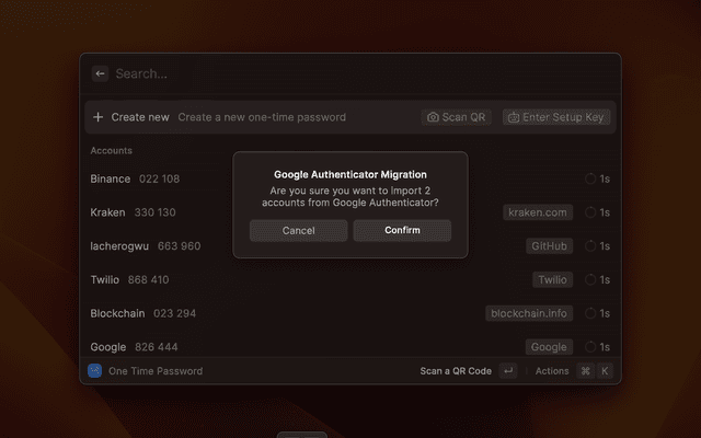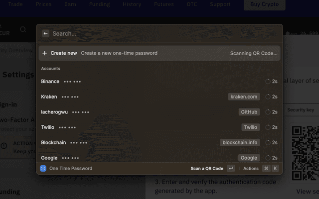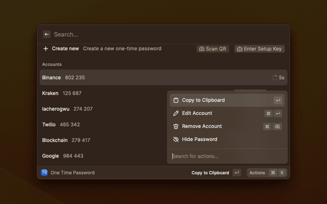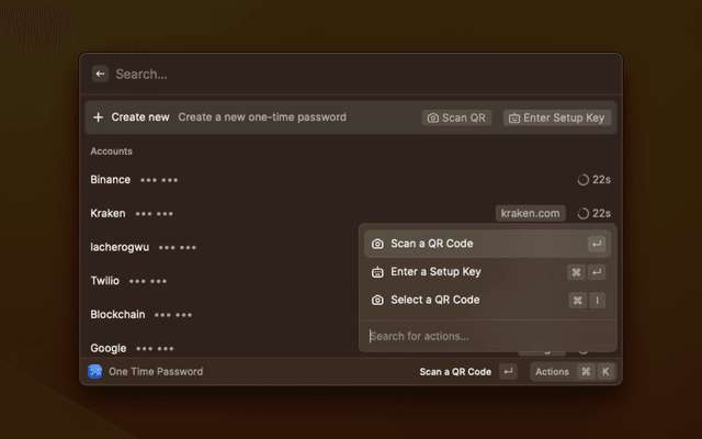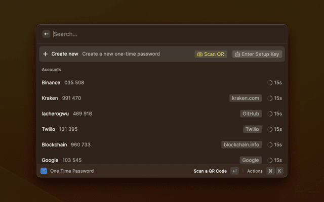 The Raycast One Time Password extension provides a convenient way to manage your One Time Passwords. With the ability to scan QR codes or manually enter secrets, the extension generates and displays Time-based OTPs.
