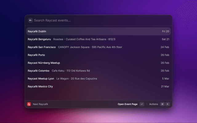 Browse upcoming Raycast Community meetups directly in Raycast.