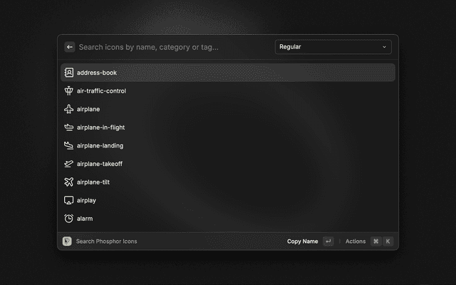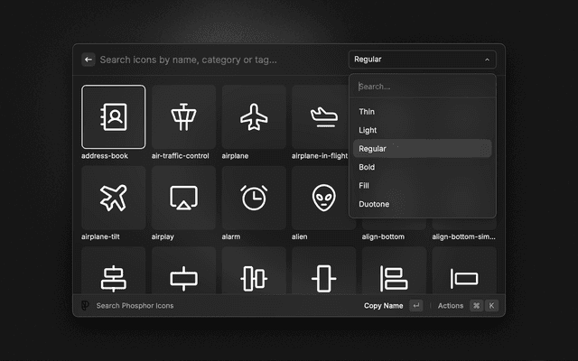 Pick icon style from search dropdown and copy icon as name, HTML element, React or Vue component