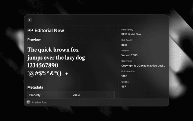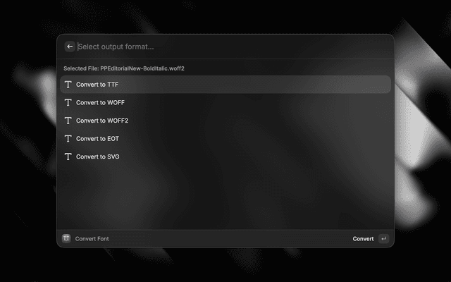 Convert fonts to TTF, WOFF, WOFF2, and EOT formats directly from Raycast