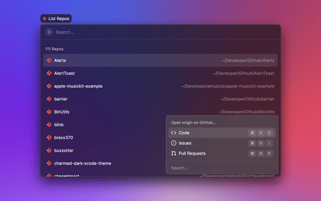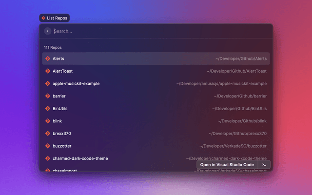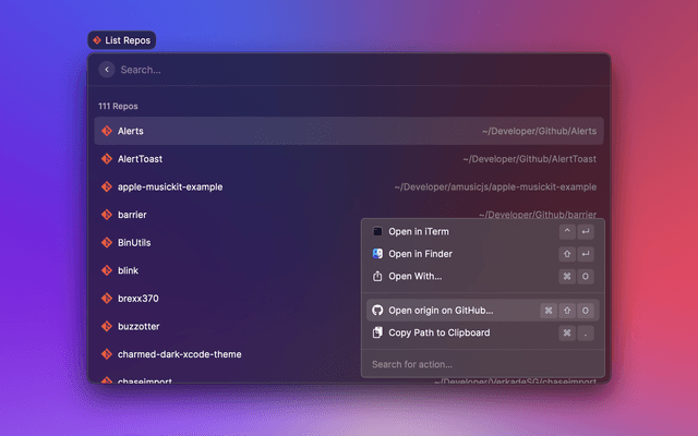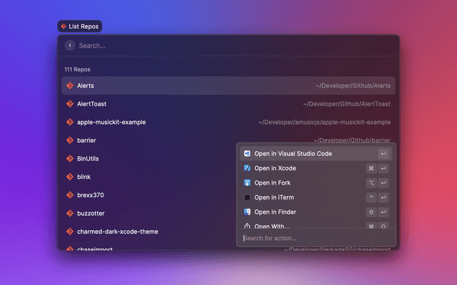 Quickly access your local git repositories and open them in your favorite editor or any app