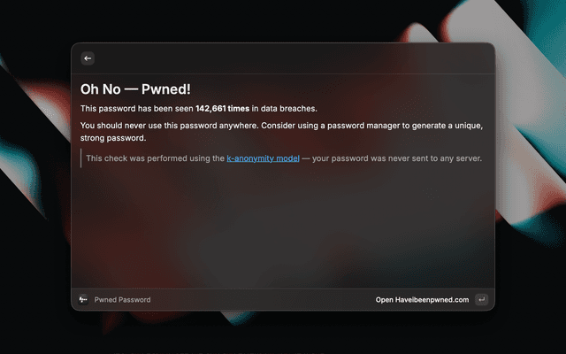 • Check if a password has been exposed using privacy-safe k-anonymity (your password is never sent to any server) with the "Pwned Password" command