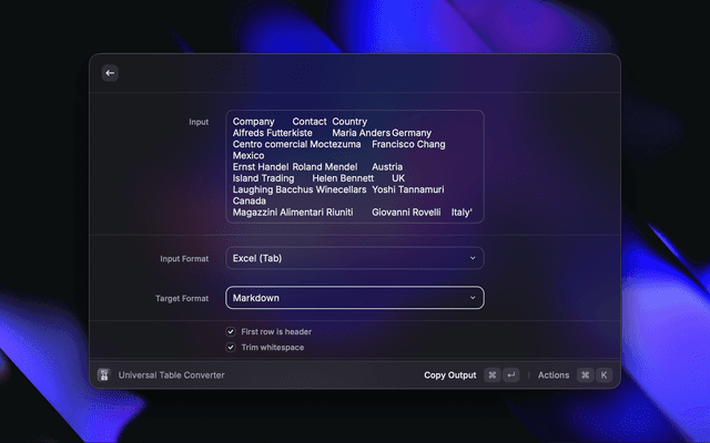 - Open Universal Table Converter: Run the command in Raycast.