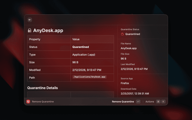 Opens a file picker (or uses your current Finder selection), then shows a full breakdown of the file's quarantine status and extended attributes. From there you can remove the quarantine flag in one action.