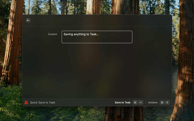 Quick Save: Save text or URLs to Teak without context switching.Search Cards: Search across Teak card content, tags, and metadata.Favorites: Open and copy from your favorited cards.https://app.teakvault.com/settingsapp.teakvault.com and api.teakvault.com.