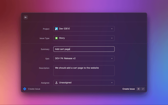 2. Select any command from the Jira extension, then press + K and scroll down to Configure Extension. Enter your email, API token, and Jira site URL (without https://) on the right. Note that all three must be provided to use API tokens.